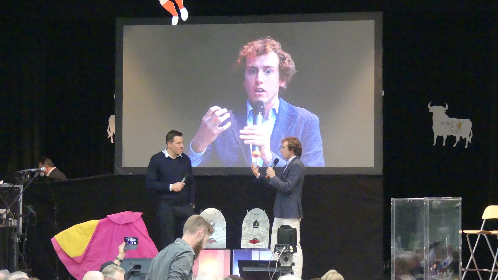Les 2 invités de la 19ème Nuit (Thomas LOMBARD et ROMAN) entourent Pierrette DURANTAU, épouse du créateur du concept Rugby Y Toros.
